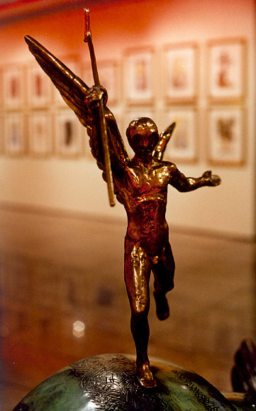 青铜 1977年至1984年 长185厘米 宽107厘米 高149厘米 235千克 蜗牛在达利的世界中占据了很重要的位置,因为它反映了达利的精神之父西格蒙德·弗罗伊德的心理哲学。尤其在早期的超现实运动中,达利的作品包含了很多的心理学因素。他认为任何事情不会无缘由的发生,所以当他在弗罗伊德的房外看到挂在自行车上的一只蜗牛时,联想到一个人的脑袋,好像是弗罗伊德的脑袋。达利对蜗牛壳的几何图形和内部构造十分着迷,就像鸡蛋一样,外硬内软。蜗牛缓慢、悠闲的脚步代表宇宙中的时间,而矛盾地被达利插上了翅膀给予了速度,使它飞快地波状滑行。雕刻中的天使手扶蜗牛的背,赐予它无限的速度。 |