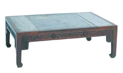 这张炕桌长96厘米,宽64厘米,高32厘米,通体以楠木制成。炕桌设计精巧,桌面平直长方形,上面镶银板,银板上刻有十几个数理用表。桌面上的正中银板可以掀开,打开银板,可以看到桌内有存放计算和绘图工具的各式格子。桌面下方牙板为直牙条,牙子上铲地浮雕夔龙拐子纹,四条腿足直下,足端雕成内翻马蹄足。炕桌式样虽然是中国传统的家具式样,但是它却是康熙帝晚年读书和学习西洋科技知识的专用炕桌,因而非常珍贵。