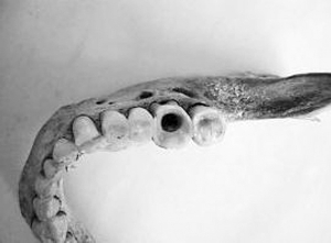原来,在这具8000年前的头骨的一颗下牙上,有一个深深的洞,这个洞引起了人们的好奇。为什么旁边的牙齿都完整如初,唯有这颗牙齿上有一个大洞?席永杰连忙翻看头骨的上牙,发现上牙同样的位置,竟然也有一个同样的大洞。