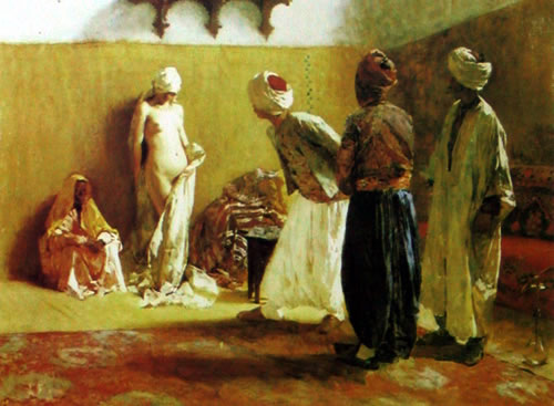 画家以写实的绘画技巧,生动地描绘了贩卖女奴的过程。这是19世纪时阿拉伯普遍的习惯,被剥光了衣服的女奴,赤身裸体站在墙边,屈辱地接受买主的查验。画家以奔放的笔触,强烈的光感,表现了这一场面。