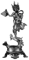 | 传说魁星是文运之神,乃天上的文曲星下凡。魁星连续三次考状元都未中,原因就在他相貌极丑。 魁星一怒之下将装书的木斗踢掉,投江而死。魁星虽未中三元,而民间百姓却仰慕其才华,将他塑造为神,借“魁星踢斗”之题,以求文运高照。此魁星以上好红铜浇铸,高19.8厘米,其发上翘,突目而獠牙;右手高举执斗,左手前伸握有银锭;一足跷起,一足独立于鳌头之上;袒胸露乳,腰扎虎皮。为典型的元代神仙造像。(信息来源:新民晚报 无极) |