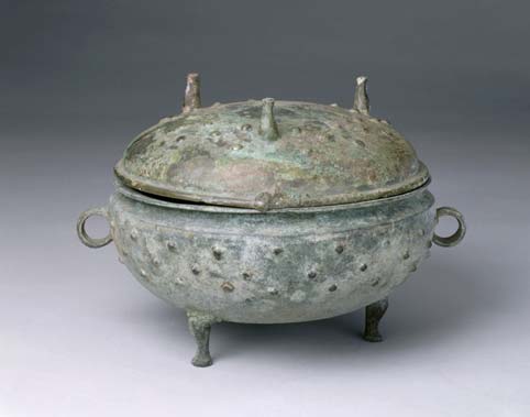 敦侈口,束颈,耳作环形,圜底下具三个兽蹄足。盖与器不完全对称,盖低于器高,无耳,上有三个兽蹄形钮,可却置。盖、器通饰乳丁纹。