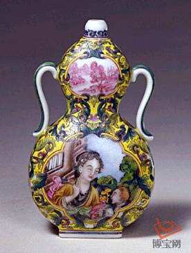 此瓶纹样描绘细腻,尤其是开光内的西洋女子衣着华丽,因采用了西洋画的明暗透视技法而具有立体效果。葫芦形的瓶体和山水图案则体现了中国传统的文化意味。东西文化的交融在这件器物上达到了和谐的统一。