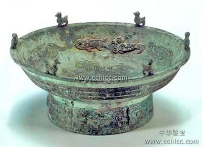 敞口折沿,敛腹高圈足,口沿上均匀地分饰六个圆雕小鸟,外壁饰目纹,圈足饰兽面纹,盘内底中央饰龟纹,龟背上有圆圈纹,壁上饰三组动物纹,每组有一鱼一鸟一虎。