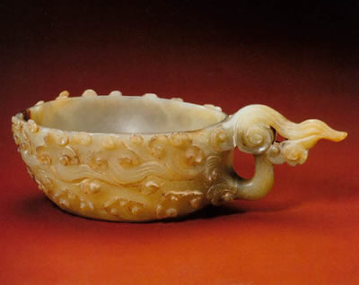 说明:玉料青绿色。器为一立雕器皿,形作朵云形,亦于腹外壁饰浮雕朵云纹,以镂雕朵云之尾巧作柄。