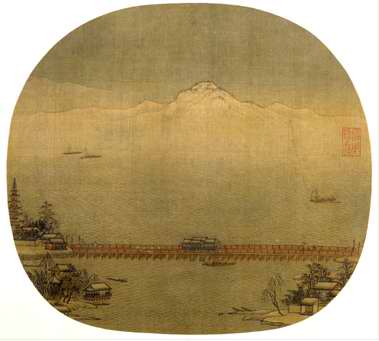 《长桥卧波图》页,宋,绢本,设色,纵23.9cm,横26.3cm。 本幅无款印。 钤收藏印“仪周珍藏”一方。 图中高架平湖的木桥刻画精微,与波澜不兴的水纹相映成趣。画面大片的空白使得作品兼具坚实与空灵之美,虚实相生的艺术效果给观者以“无画处皆成妙境”的想象空间。(来源:新华网) |