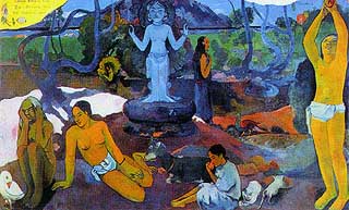 高更把塔希提岛那未经开发的,充满原始生命力的土地看作是人类的"乐园",当他面对着塔希提岛上那些未失去原始面貌的大自然风光,面对那些肤色黝黑,体格健壮,显示着原始人的野性美,心地善良,面孔笃诚,因思想简单淳朴而格外虔敬的土蓍人时,他为此激动不已,认为这正是他所追寻的"乐土"。为此,他画了一批如梦如诗,带点儿神秘意味的画作。此画作于1897年。是高更以最大的热情完成的一幅"宏伟的作品"。这段时期的画家贫病交近,心情沮丧,极端愤世疾谷,便决定自杀,他曾喝下毒药却未遂。就是在这种逆境中,高更以巨大的创作热情画了此画。他说他画此画时像作一场梦,当梦醒了时,他才对着完成了他的作品,道出了贯穿始终的构思:"我们从哪里来?我们是谁?我们住哪里去?"这就是此画的主题。此画的右边有一个刚刚诞生的婴儿,中间有一个采摘水果的青年,左边是一个行将就木的老妇。这一连串的形象,意示着人类从生到死的命运。虽然其形象,色彩和构图看上去象是神话或传说,那富有的异国的渺远,静悄悄和神秘的意境再加上这样一个标题,使人感到更加神秘。其实,画家在此只是表现那些土著人一种偶然的臆想。此画可以说是高更多年来对塔希提岛的印象的综述是他献给自己的墓志铭。