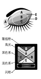 用大头眼影刷一端,将A扫于整个上眼睑和内眼角