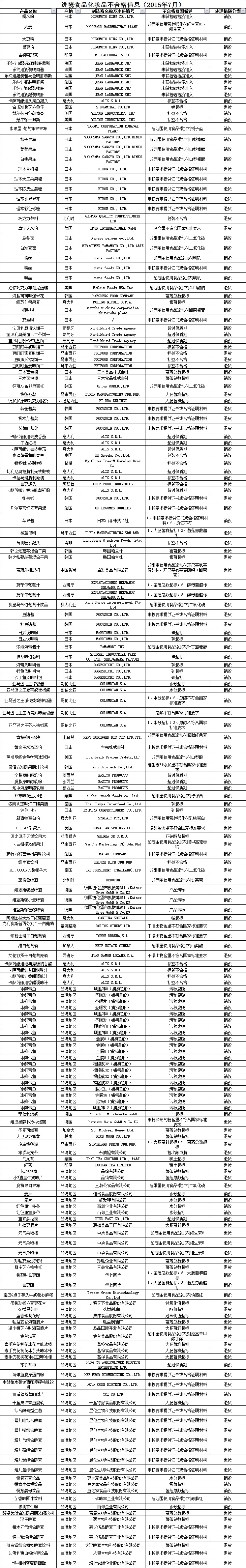 质检总局提示,进口不合格食品、化妆品信息仅指所列批次食品、化妆品。表中所列批次食品、化妆品的问题是入境口岸检验检疫机构实施检验检疫时发现的,都已依法做退货、销毁或改作他用处理;这些不合格批次的食品、化妆品未在国内市场销售。