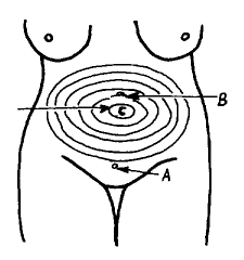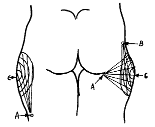 手术方法:⑴画线和切口的选择:取直立位,在被抽吸区内画出“同心圆线”和“抽吸隧道线”作为标记(最好用两种不同的颜色区分)。同心圆线:根据脂肪堆积情况,画出边界线及抽吸范围。然后,以线内最高部位(即脂肪最厚区)为圆心,在边界线区域内画出若干同心圆线 (图1)。切口:切口一般长约0.5~0.8 cm, 选择在纵轴线及其延长线或横轴线上的较隐蔽处。抽吸隧道线:以切口为起点,向同心圆区画出若干放射状线,线间距相等,排列成扇形[6],称之为抽吸隧道线。常有必要在纵轴线上或横轴线上的隐蔽部位选择第二个切口,同法画出另一组扇形的抽吸隧道线。两组扇形线互相垂直交叉成网状 (图2)。⑵麻醉:切口用0.5%利多卡因浸润麻醉。抽吸区用配制的复方利多卡因溶液作脂肪浅层和深层的浸润麻醉。浸润量约为估计抽出量的1~1.5倍,注射后该区出现水肿,手感发硬。记下每区注射量,做到左右对称。配制液处方:生理盐水1 000 ml,利多卡因400~1000 mg,肾上腺素0.5~1.0 mg ,5 %碳酸氢钠溶液12.5 ml[7,8]。抽吸范围大时,可在局麻的基础上,静脉点滴异丁醇(diprivan)加强止痛效果。硬膜外麻醉是可选择的麻醉方法之一,在抽吸区内灌注相同数量不含利多卡因和碳酸氢钠的配制液,以利于抽吸和减少出血。⑶手术和塑形要点:抽吸时,参考皮肤上扇形抽吸隧道线的位置,在相对应的脂肪隧道中,依次往来抽动吸头,吸出脂肪。动作要轻柔缓慢。近同心圆中心区脂肪厚,多抽吸。一般先抽脂肪深层,后抽脂肪浅层。通过两个切口,分别在两组交叉扇形隧道内抽吸,互为补充,能抽出更多脂肪,不易出现凹槽,使外观更自然,手感更平整、均匀。抽吸完毕,用抽吸头,通过抽吸隧道,向边界线外延伸3 cm左右(注意此时不抽吸),使边界两侧皮肤伸延自然。被抽吸区皮下脂肪保留1 cm为宜。抽吸过程中,时刻观察透明抽吸塑管的颜色,如有出血及时改变抽吸方向和位置。伤口内可不放引流。抽吸区用弹力带包扎[9]。